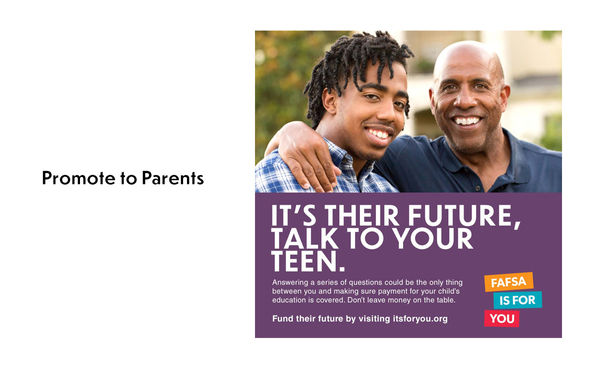 Download the FAFSA promotional toolkit, including social media graphics, printable posters, and more.